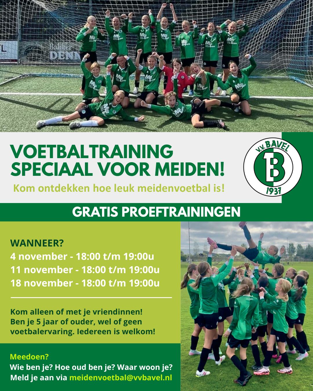 Kom alleen of samen met je vriendinnen. Meld je aan via meidenvoetbal@vvbavel.nl en vermeld: