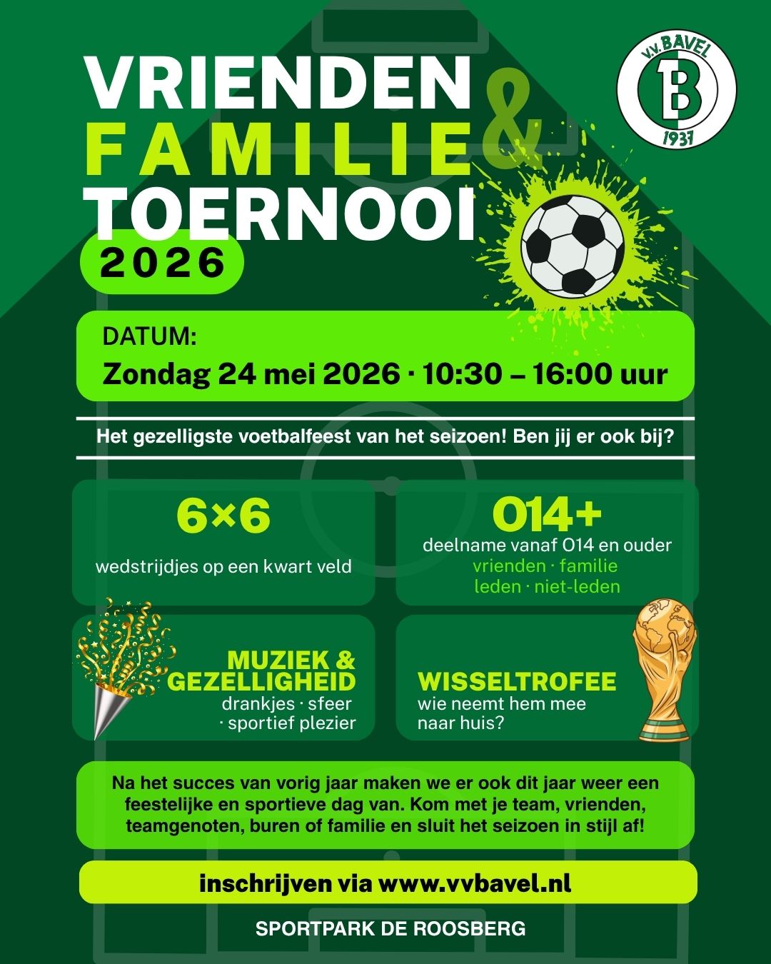 Op zondag 24 mei is het weer zover: het jaarlijkse Vrienden & Familie toernooi op de velden van v.v. Bavel. Een vaste traditie die elk jaar weer zorgt voor een sportieve en gezellige afsluiting van het seizoen.