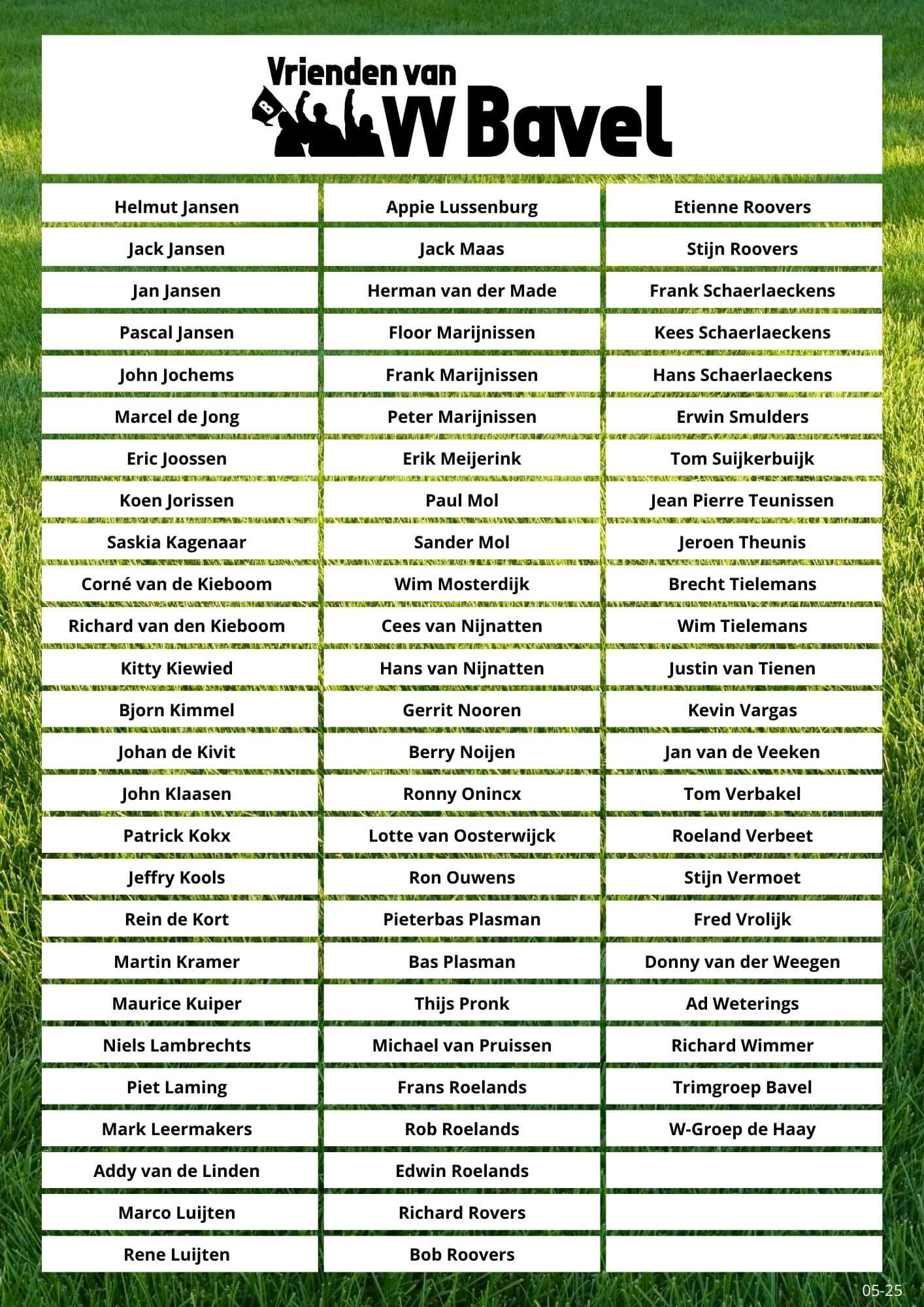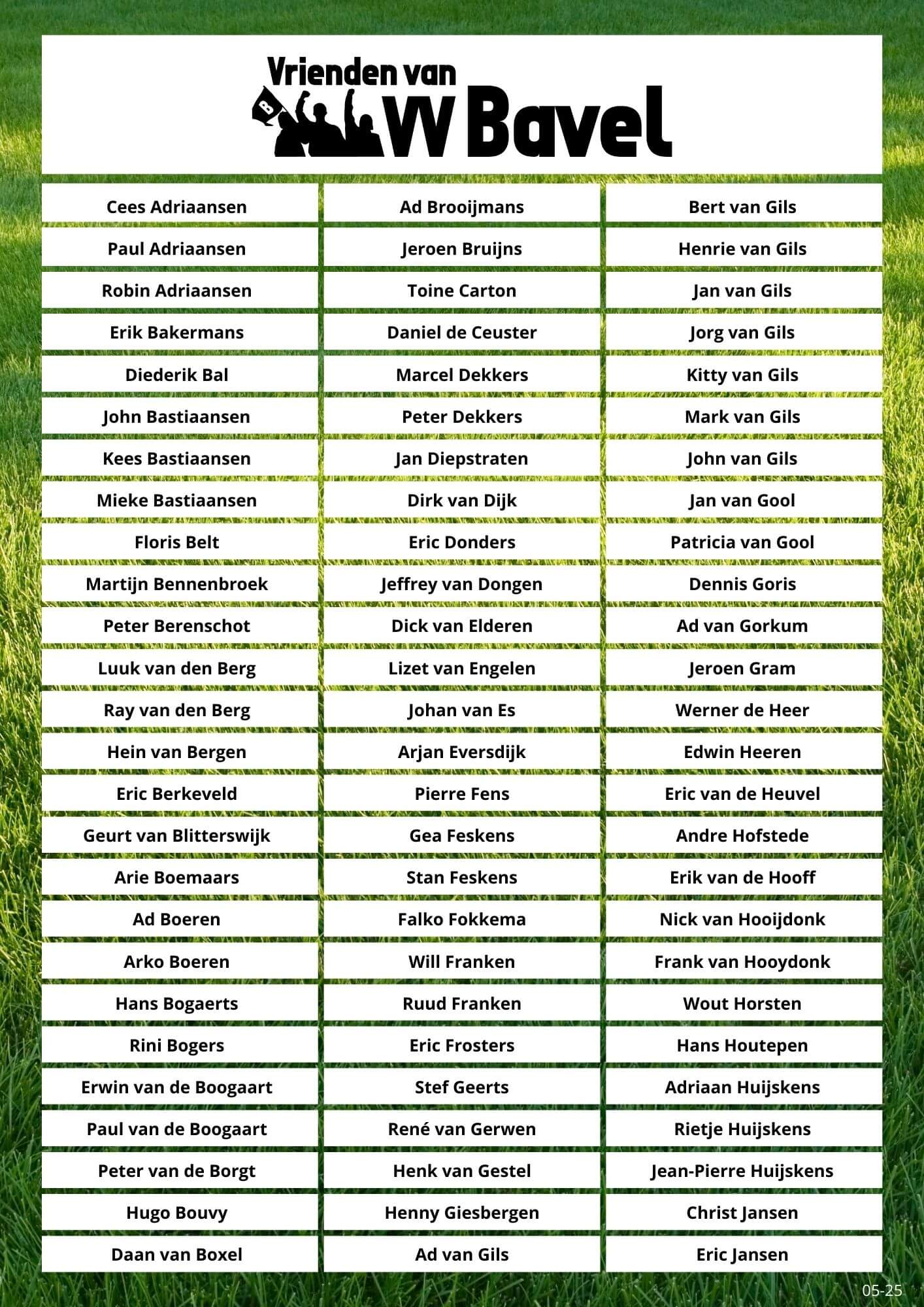 Vrienden van v.v. Bavel bestaat sinds jaar en dag en tot voor kort stonden ongeveer 20 trouwe leden op de lijst. Inmiddels is dit aantal bijna verzevenvoudigd tot 148 leden! Onderaan op de pagina vind je de ledenlijst.